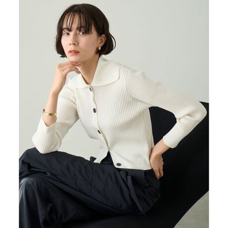 ■デザイントレンドの衿付きニットカーディガン。コンパクトなクロップド丈と大きめな衿が今年らしく、前ボタンをとめたトップスとしての着こなしがおススメ。ボリュームボトムと相性よく着て頂けます。