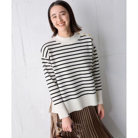 ■デザイン左肩にあしらった金ボタンがポイントのハイネックプルオーバー。首まわりが詰まり過ぎず、少し余裕を持たせた女性らしいオフネックにしています。前後差のあるレングスとサイドのスリットで、腰回りももたつかず、どんなボトムとも合わせやすいデザインです。