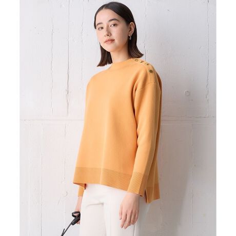 ■デザイン左肩にあしらった金ボタンがポイントのハイネックプルオーバー。首まわりが詰まり過ぎず、少し余裕を持たせた女性らしいオフネックにしています。前後差のあるレングスとサイドのスリットで、腰回りももたつかず、どんなボトムとも合わせやすいデザインです。