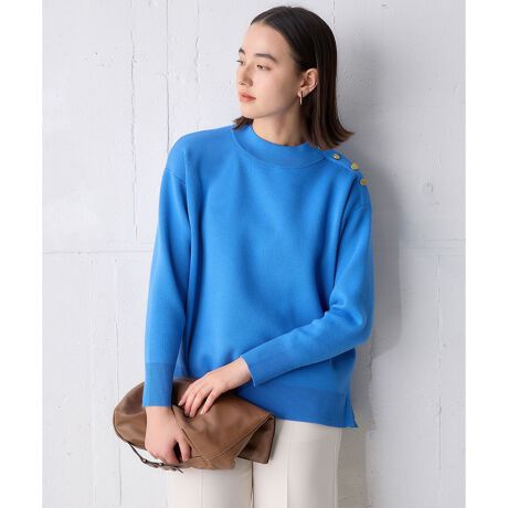 ■デザイン左肩にあしらった金ボタンがポイントのハイネックプルオーバー。首まわりが詰まり過ぎず、少し余裕を持たせた女性らしいオフネックにしています。前後差のあるレングスとサイドのスリットで、腰回りももたつかず、どんなボトムとも合わせやすいデザインです。