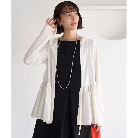 ■デザインジップタイプのラッシュガードカットソー。夏の紫外線が気になるお出かけだけでなく、水際のシーンでも着用可能なアイテムです。袖が長めになっており、手の甲まで隠すことができ、さらにフードも付いているので首元の日焼け対策も安心です。分量感のあるペプラムデザインなので、ヒップもカバーしてくれ万能アイテムです。ペプラム部分と同素材のショートパンツに合わせてセットアップとしても着用も可能です。ブラック(005)のペプラム部分のカラーは、チャコールです。サンド(043)、オフ(001)はラッシュガード部分と同色です。