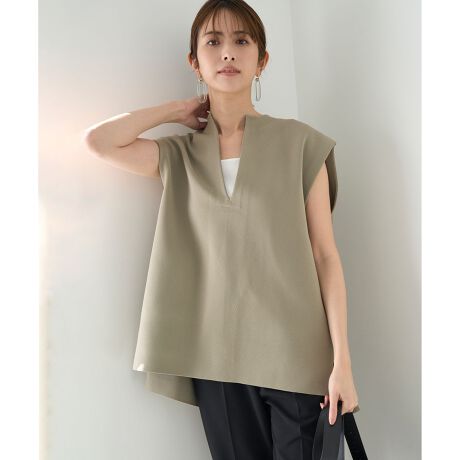 ■デザインゆったりとしたフォルムのミラノリブニットジレ。フロントは深めにあいたキーネックで、どんなインナーとも合わせやすく、後ろ中心に入ったボックスプリーツ、前後差のあるヘムライン、スリットなど全方位にポイントがあるデザイン。軽やかな一枚仕立てで、二の腕のカバーや冷房対策など実用面はもちろん、シャレ見え効果も抜群。ボトムを選ばないミドルレングスで、コーデにプラスするでけでサマになるアイテムです。