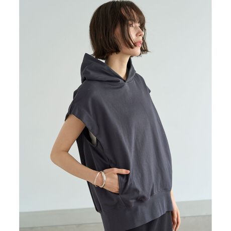 ■デザインコクーンシルエットのノースリーブフーディです。全体的にゆったりとしたシルエットに、きゅっと絞った裾リブでメリハリを効かせています。身頃とアームホールはゆったりと幅をとり、レイヤードもしやすいデザインです。肩が落ちるデザインで、腕回りもカバーしてくれます。1枚で着てはもちろん、薄手のカットソーをレイヤードさせてもカジュアルに着用いただけます。