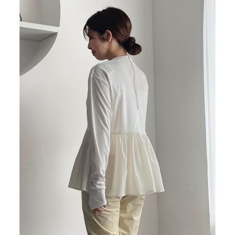 ■素材SPFという特殊な生地を使用。ナチュラルなストレッチ性があり、光沢感が強すぎない上品な素材です。また、海やプールでも使用可能です。(高濃度塩素処理水の堅牢度をクリアしているため)しわにもなりづらく、お出かけが多い夏の持ち運びにも便利なイージーケア素材です。ペプラム部分は、圧倒的な軽さとストレッチ性を持ったマルチファンクション素材。ドライタッチのマットナイロンを採用しミニリップストップの織り組織にしているため、肌離れも抜群です。
