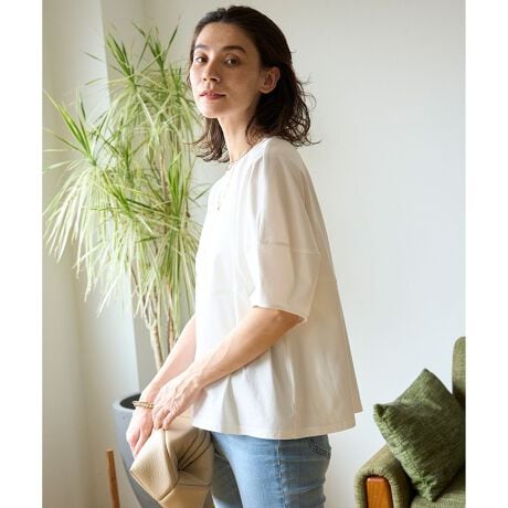 ■デザイン1枚で着映え力が抜群なランタンスリーブのプルオーバー。ウエストから袖にかけて流れるように続くランタンスリーブのカッティング、さらに大きめのドルマンスリーブで、Tシャツながらサマになるシルエット。着丈とネックの開きや袖の長さにこだわり、ウエストインでもアウトでもバランスよく着られるように仕上げました。