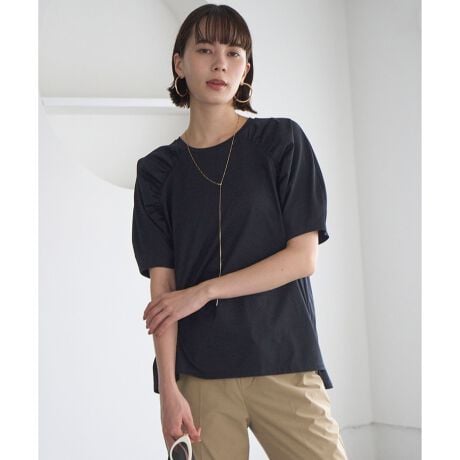 ■デザインラグランスリーブの袖付けをギャザーにすることで、肩輪毬の華やかさを演出したデザイン。丸みのある袖のボリューム感が女性らしく、1枚で着映えるTシャツです。二の腕もカバーしてくれる安心の袖丈も嬉しいポイント。