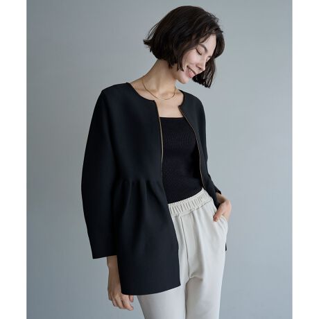 ■デザイン前後着用可能な2WAY仕様の、ZIP付きペプラムカーディガン。ペプラムの切り替え位置を腰高に見える位置にしているので着るだけでスタイルアップ効果が期待できます。8分袖のボリュームスリーブとペプラムが華やかで女性らしい印象です。