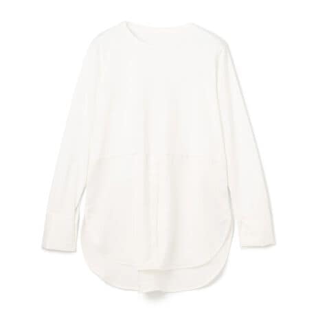 ■デザインロンTにカフスとシャツの裾部分をドッキングしたデザインで、スウェットやニットにインするだけでこなれたシャツレイヤードの見え感が叶います。身頃部分はカットソーならではの着心地の良さで、シャツを重ねた際のゴワゴワ感が苦手な方でも快適に着用いただけます。前後差のついたやや長めの丈感で、気になる腰回りもさりげなくカバーしてくれます。