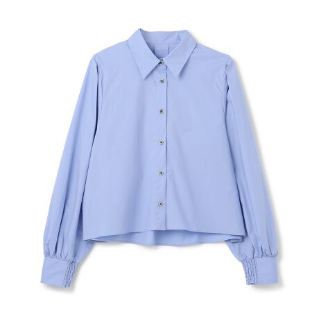 ■デザインボリュームスリーブが華やかなクロップドシャツ。カフスの内側にシャーリングを施し。たくし上げやすくしています。袖をたくし上げるとボリューム感が際立ち、より華やかな印象で着用いただけます。配色ボタンやコンパクトな襟がアクセントになりモードっぽい印象。