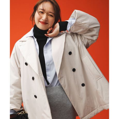 ■デザインAラインシルエットが女性らしい中綿Pコート。カジュアルになりがちな中綿コートをステッチレスで柔らかくキレイめに仕上げ、オンスタイルにも馴染みやすいデザインに仕上げました。厚手のニットも重ねやすいワイドスリーブの袖は、あえて短めにしており、袖口からニットやアームウォーマーを覗かせてレイヤードをお楽しみいただけます。ボタンを留めずにラフに羽織ったり、チンストラップを留めて衿を立てた着こなしなど着回し力抜群のコートです。