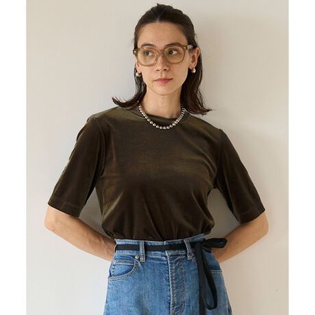 ■デザインベロア素材が目を引く、柔らかな風合いのベーシックTシャツ。微光沢感が上品な大人のTシャツに仕上げました。首に沿う様なネックラインと、やや長めの5分袖丈でシンプルながらもキレイなシルエットです。レイヤードも想定し、身幅は大きすぎないシルエットでお作りしております。後ろ中心の表振りもポイントです。
