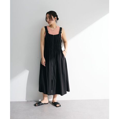 たっぷりとギャザーを寄せたデザインがフェミニンなジャンパースカート。フロントジップは上下どちらからでも開閉でき、着こなしに合わせて調節していただけます。ウエストにはシャーリングゴムを配し、リラクシーな着心地も魅力的。合わせるアイテムによって印象が変わり、レイヤードスタイルを楽しめる一枚です。透け感[ややあり]