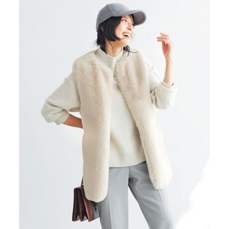 ■素材ふんわりと軽く柔らかな毛足感と程よい光沢感が上品な印象のオリジナルブレンド素材。裏面をスポンディッシュなポリエステルを接結編みにすることで、肌あたりよく、毛付を軽減しています。