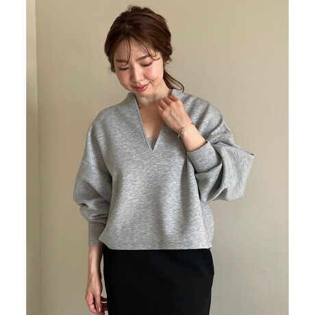 ■デザインシャープなVラインのキーネックデザインで、スウェット感覚で着られる手軽さと、きれいめを両立した便利な1着。ハリ感と滑らかな風合で、カジュアルダウンしすぎずに女性らしい雰囲気で着用していただけます。カジュアルなジャージー素材を洗練された印象に仕上げるキーネックデザインのプルオーバーは、体が泳ぐサイズ感とボリューム袖を取り入れたサマになるフォルム。肩を落としたドロップショルダーやゆとりのある袖周りで、フロントはやや短めでクロップド丈に仕上げスタイルアップが叶います。後ろ裾のみにゴムを入れた立体感のあるコクーンシルエットで、バックシルエットもふんわりカバーしてくれます。バランスよくアウトして着られるほどよいクロップド丈が着こなしやすさと、トレンド感にも一役買います。キャミソールやTシャツ合わせのレイヤードスタイル、同素材のスカートと合わせてセットアップスタイルなど着回しを楽しめるアイテムです。