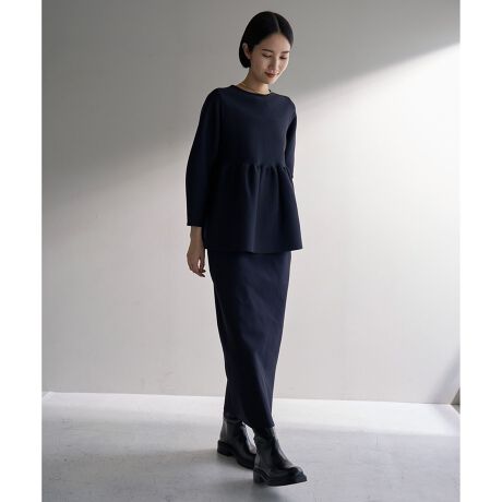 ■デザインペプラムジレ(KRUMCW0331)・ペプラムZIPカーディガン(KRUMCW0332)と同素材のナロースカート。セットアップとしてはもちろん、単品でもオンオフ問わず使える万能アイテムです。ストレッチが効いた編地ですっきりタイトめなシルエットなので、ボリュームトップスともバランスよく着用いただけます。