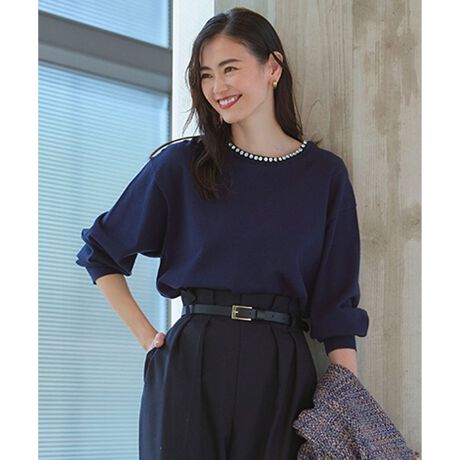 ■デザイン大粒の詰め付ラインストーンをネックラインにトリミングし、お顔回りを華やかに演出してくれるプルオーバー。程よく体にフィットし過ぎないサイズ感でジャケットのインナーでも、一枚着でも着映えするアイテムです。
