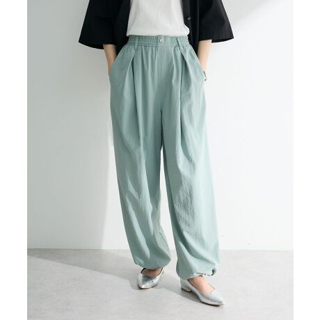 肌触りの滑らかな素材で仕立てたデザインパンツ。ウエスト内側にタックを入れたワイドシルエットで、裾のドロストコードを調整してお好みのラインに変えられるのも魅力的です。ウエストにはゴムを配し、リラクシーな穿き心地も嬉しいポイント。春らしいくすみカラーを加えた色展開にも注目です。透け感[なし]