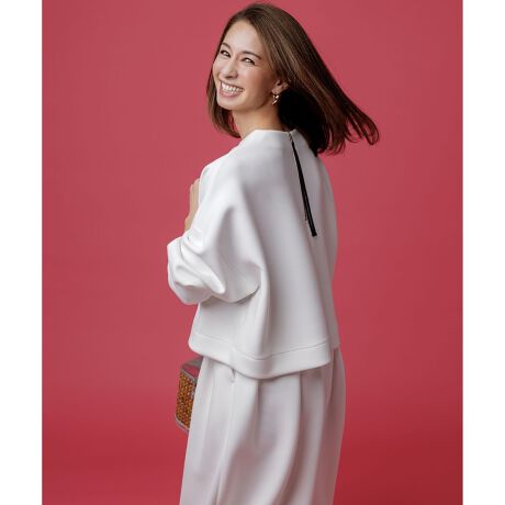 ■デザインクロップド丈のワイドシルエットに、ボリューム感のあるスリーブのバランスで、着るだけで構築的なフォルムに見せてくれるトップスです。着脱のしやすい後ろ中心のゴールドメダルジップは後ろ姿のアクセントにもぴったり。甘すぎないブラックテープ使いもポイントに。同素材のコクーンスカートとのセットアップコーデもお楽しみいただけます。