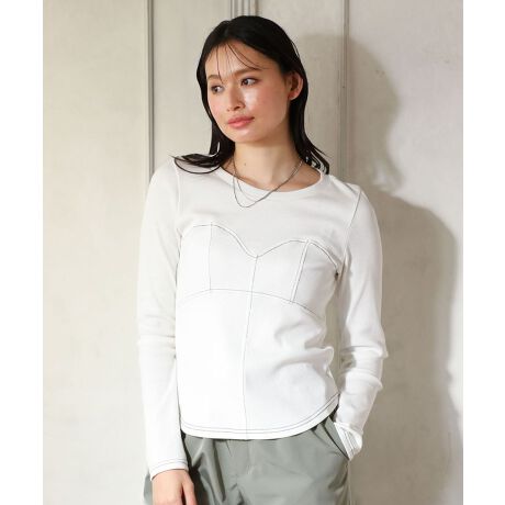 伸縮性に富んだリブ素材で仕立てたロングスリーブTシャツ。切り替えステッチで表現したビスチェラインが洒落感たっぷりで、まるでレイヤードしているような印象のデザインです。丸みのあるヘムラインがスタイリングをすっきりと演出。様々なテイストのボトムと合わせやすく、デイリーに活躍するおすすめのアイテムです。透け感[なし]