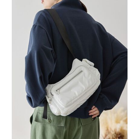 セミマットなパファー素材で仕立てたショルダーバッグ。外ポケットや内ポケットが充実した収納力の高さが魅力的なデザインです。きらりと光るメタルジップがアクセントをプラス。ころんとしたミニマムサイズでどんなスタイルにも合わせやすく、デイリーに活躍するおすすめのアイテムです。※モデル着用画像は、光の当たり具合で色味が違って見える場合がございます。※お使いのモニター環境によって商品の色味が違って見える場合がございます。