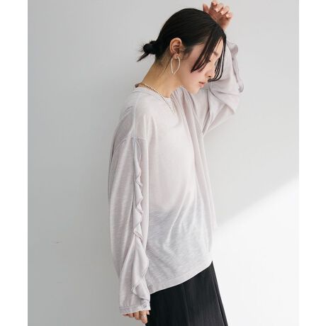 トレンドのシアー素材で仕立てたロングスリーブTシャツ。フェミニンなラッフルスリーブが目を惹き、気になる二の腕ラインもすっきりと演出します。ゆとりのあるサイズ感で快適な着心地なのも魅力的。透け感を生かしてインナーとのコントラストもお楽しみいただけるおすすめのアイテムです。透け感[あり]