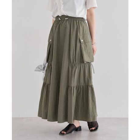 ハリと光沢感のある素材で仕立てたスカート。ふんわりと広がるティアードデザインがフェミニンで、ドロストコードを調整してお好みのシルエットに変えられるのも魅力的です。マチ付きの立体的なポケットがカジュアルなアクセント。様々なテイストに合わせやすく、デイリーに活躍するおすすめのアイテムです。透け感[ややあり]