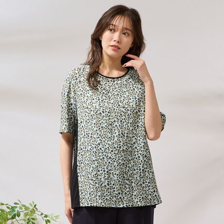 表面のプリントに金色のラメ糸で所々アクセントを付けた生地が華やかに演出してくれ、ブラウスの様にきちんと見えする着映えるカットソー。