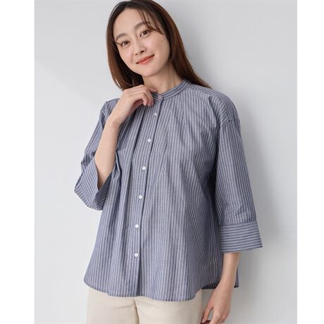 ストライプ柄が爽やかな印象を演出するバンドカラーシャツ。