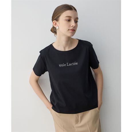 ラインストーンで表現されたロゴが目を惹くTシャツ。