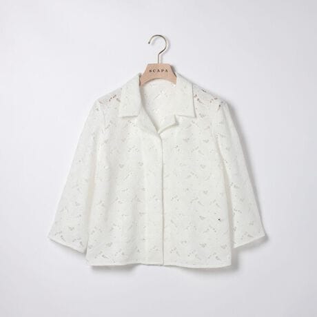 ボタニカル柄のレース素材を用いたブラウス。コンパクトなシルエットとオープンカラーを採用し、春夏らしい軽やかな印象に仕上げています。フロントの留め具が表に出ない設計で、ジャケットのようなきちんとした表情を備えているのも特徴。ワンピースなどの上からさらりと羽織るスタイルも、バランスよくまとまります。