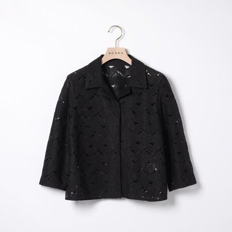 ボタニカル柄のレース素材を用いたブラウス。コンパクトなシルエットとオープンカラーを採用し、春夏らしい軽やかな印象に仕上げています。フロントの留め具が表に出ない設計で、ジャケットのようなきちんとした表情を備えているのも特徴。ワンピースなどの上からさらりと羽織るスタイルも、バランスよくまとまります。