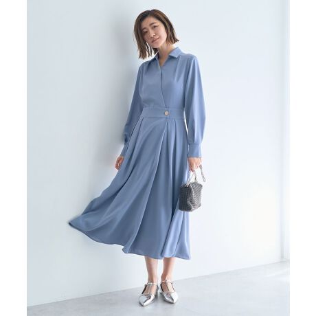 襟付きのVネックが顔まわりをすっきりと見せ、女性らしい雰囲気を演出します。