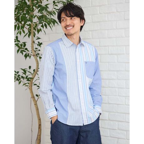 レギュラー襟のストライプシャツです。異なる三柄のストライプ