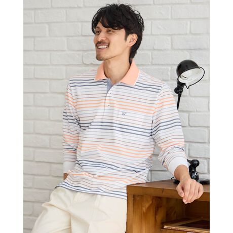 涼感ある爽やかな配色のボーダーポロシャツです。さらっとした肌触りの鹿の子生地を使用しています。1枚着としても、インナーとしても活躍するアイテムです。