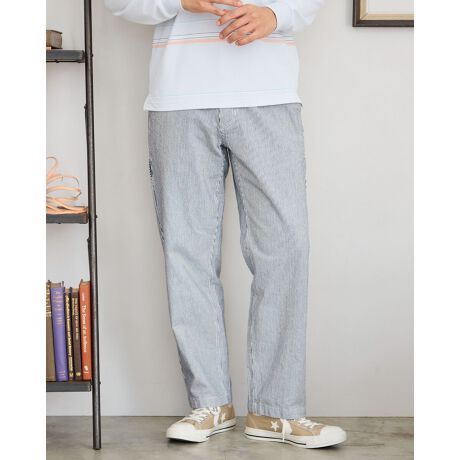 やや薄地の6.7オンスのデニム&ヒッコリー生地を使用しています。ウエストゴムのイージー仕様で快適なはき心地が魅力です。様々なスタイルに合わせやすいレギュラーシルエットに仕上げました。