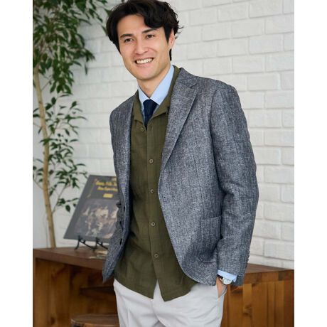 腰パッチポケット仕様の二つボタンテーラードジャケットです。涼感のあるカラミ素材にプリントを施し、通気性に優れた生地特性を活かした半裏仕様に仕上げました。裏地には半袖の上に着ても張り付かず肌ばなれの良いメッシュ生地を採用。春から夏にかけて長い間でお楽しみいただけます。