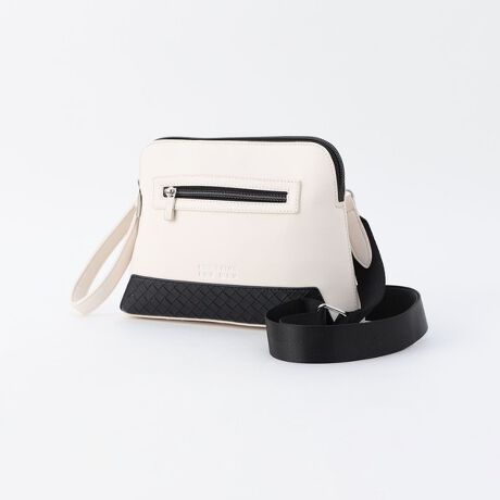 型押し合皮の切り替えがスタイリッシュな印象のショルダーバッグ。手首を通して持ち運べるハンドストラップも付属し、クラッチバッグとしても使用できる2WAY仕様です。フロント底部に刻印したブランドロゴをアクセントに、モードな装いを演出するトレンド感溢れる逸品です。