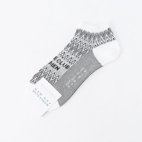 シェブロン(ヘリンボン)柄×ロゴデザインのショート丈ソックス。国内工場で編み上げた上質な仕上がりの日本製ソックスです。ピッチアレンジを効かせたシェブロン柄をベースに、足の甲にはスタイリッシュな印象のブランドロゴをジャカードで表現したオリジナリティ溢れる一足。スニーカーとの相性が特にピッタリのソックスです。ブランドネーム入りの口紙付き包装なので、ちょっとしたギフトにもおすすめです。