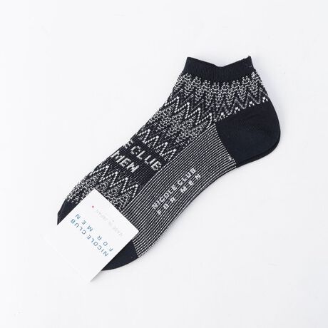 シェブロン(ヘリンボン)柄×ロゴデザインのショート丈ソックス。国内工場で編み上げた上質な仕上がりの日本製ソックスです。ピッチアレンジを効かせたシェブロン柄をベースに、足の甲にはスタイリッシュな印象のブランドロゴをジャカードで表現したオリジナリティ溢れる一足。スニーカーとの相性が特にピッタリのソックスです。ブランドネーム入りの口紙付き包装なので、ちょっとしたギフトにもおすすめです。