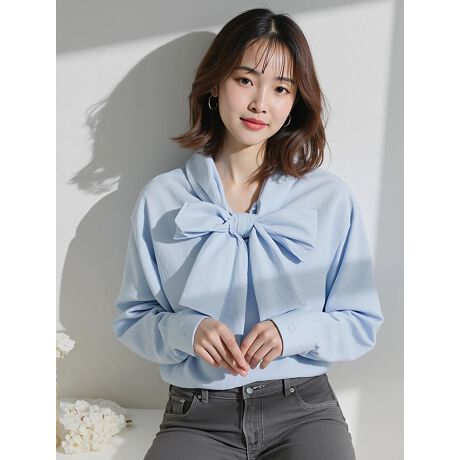フロントに結んだ大きなリボンがアクセントになったブラウスは、肩に大判のスカーフを巻いたような後ろ姿も魅力的です。カジュアルなパンツにもフェミニンなスカートにも合わせやすく、幅広いスタイリングに活躍するアイテムです。