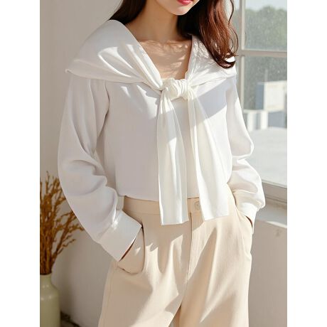 フロントに結んだ大きなリボンがアクセントになったブラウスは、肩に大判のスカーフを巻いたような後ろ姿も魅力的です。カジュアルなパンツにもフェミニンなスカートにも合わせやすく、幅広いスタイリングに活躍するアイテムです。