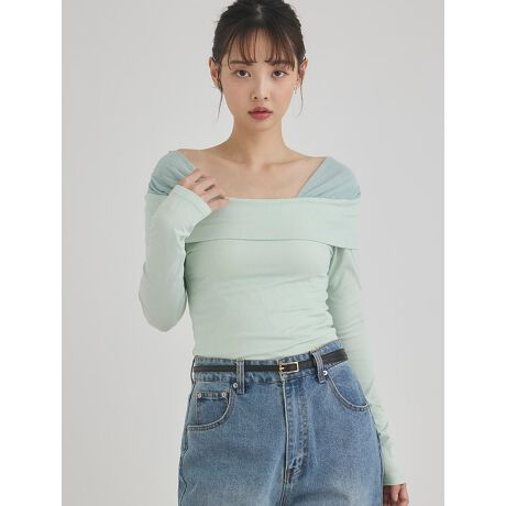 オフショルダーが女性らしいドッキングトップス