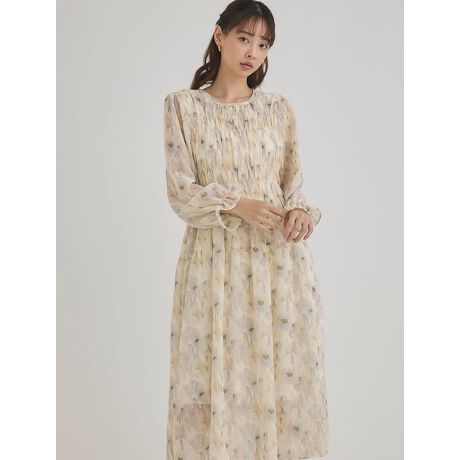 水彩フラワー柄シャーリングワンピース