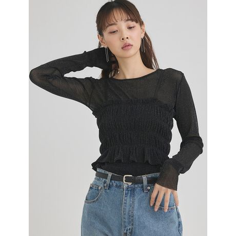 華奢なストラップとギャザーの立体感のあるビスチェに、シンプルなシアーインナーの組み合わせがフェミニンな雰囲気を演出してくれます。ビスチェとシアーインナーは別々でも着ることができるので、ワンピースにレイヤードしたり、さまざまな着こなしが楽しめます。