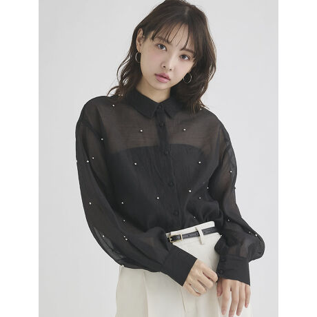 シアーの生地に程よく散りばめられたスタッズがさりげないおしゃれ感をアップさせてくれるシャツです。シアーのエレガントな透け感があり、この1枚だけでグッとこなれた印象になります。ウエストインでもアウトでもOKなのでボトムを選ばない優秀アイテム。