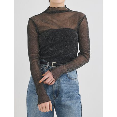 キラキラとしたラメ感が華やかな印象のハイネックトップス。ほどよい透け感のあるシアー素材に、フリルのようなメロウが女性らしさを演出してくれます。一枚着としてはもちろん、キャミワンピースやサロペットのインナーとしても活躍するアイテムです。