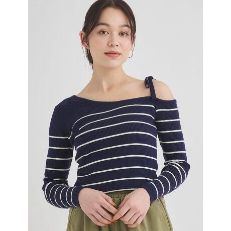 アシンメトリーなオフショルダーデザインが目を惹くボーダーニット