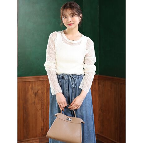 メッシュのような透かし編みが軽やかな印象のクルーネックプルオーバー。ほどよい透け感と、長めの袖が抜け感のある着こなしを演出します。インナーにタンクトップを合わせたり、キャミワンピースにレイヤードしたスタイリングもおすすめです。