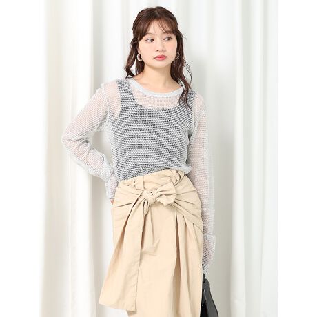 メッシュのような透かし編みが軽やかな印象のクルーネックプルオーバー。ほどよい透け感と、長めの袖が抜け感のある着こなしを演出します。インナーにタンクトップを合わせたり、キャミワンピースにレイヤードしたスタイリングもおすすめです。