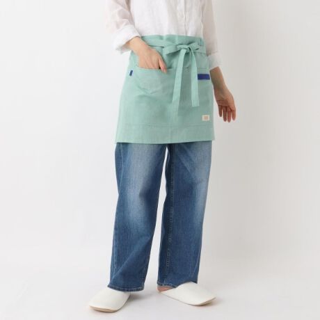 大きなポケットのついたショート丈のカフェエプロン。